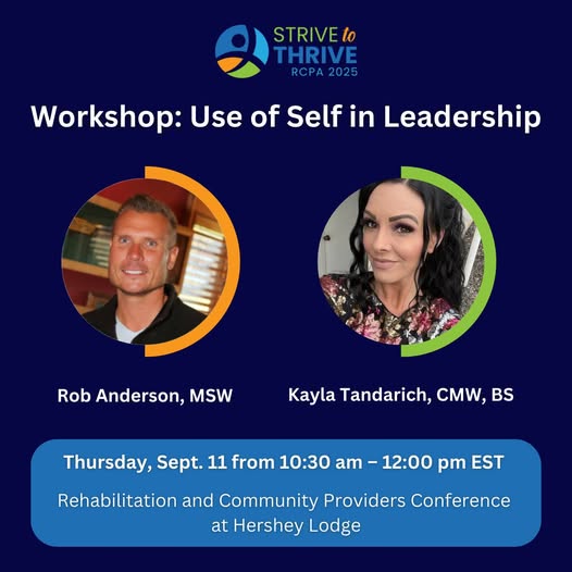 Two of our staff members, Kayla Tandarich and Rob Anderson, will be presenting a workshop next Thursday, Sept. 11 at Rehabilitation & Community Providers Association's annual conference. Their workshop, called "Use of Self in Leadership", aims to help professionals discover how self-awareness, mindfulness, and emotional regulation can transform leadership in mental and behavioral health settings.