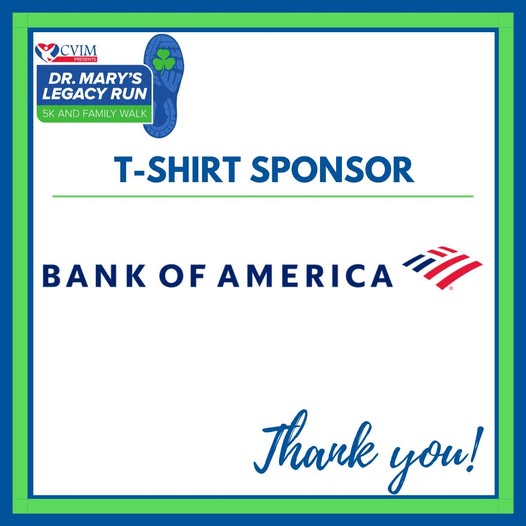 Thank you to Bank of America, the T-Shirt Sponsor for the 2nd annual Dr. Mary's Legacy Run, a 5k Run, Walk, and Family Fun Day on September 6 at West Goshen Park in West Chester. Whether you're a walker or a runner or just like having fun, we invite you to join us for this year's event, featuring face painting by Birl Girl Designs, music by Barone DJ's, and more.