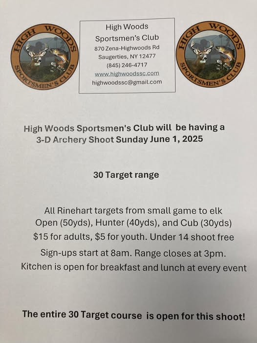High Woods Sportsman's Club High Woods Sportsmans Club Established in 1955 High Woods Sportsmans Club is a nonprofit whose purpose is to promote the interest in the conservation of the earths natural resources the safe use of firearms and archery equipment and to pass onto our youth the spirit and enthusiasm of archery and firearms skills. Next Club Event Sunday March 9 3D Archery Shoot and Swap and Sell. The Club Located on 43 acres in Saugerties High Woods Sportsmans Club features a firearms range indoor and outdoor archery ranges and a full kitchen. Learn about the property our shooting leagues events and membership.
