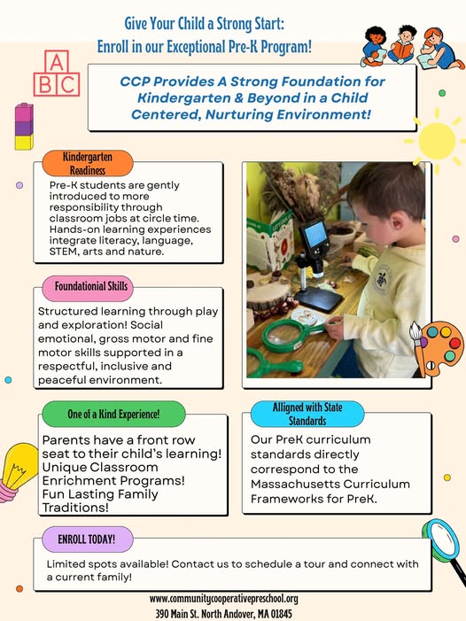 Community Cooperative Preschool – North Andover, MA – Call us Today for inquiry 978-682-9006 Openings for Fall 2025 Call for a tour today. About Community Cooperative Preschool Welcome to CCP where children and parents discover together. Our core philosophy is to partner with parents to support childrens growth and learning during the preschool years. For over 40 years CCP has provided a learning community of children families and teachers in North Andover and its surrounding towns.