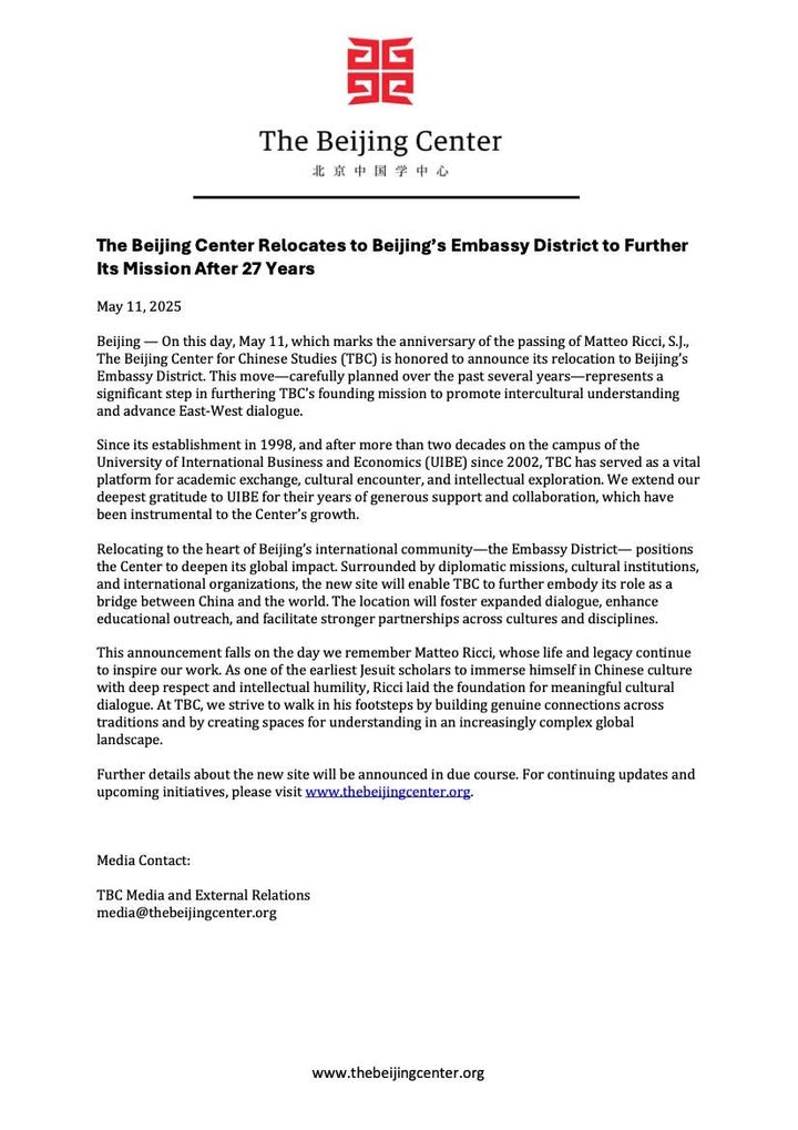 The Beijing Center Relocates to Beijing’s Embassy District to Further Its Mission After 27 Years May 11, 2025 Beijing — On this day, May 11, which marks the anniversary of the passing of Matteo Ricci, S. J. , The Beijing Center for Chinese Studies (TBC) is honored to announce its relocation to Beijing’s Embassy District.