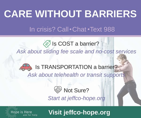 Cost and transportation shouldn’t stand in the way of getting care. We are happy to offer sliding scale fees, accept Medicaid, and provide telehealth appointments—so care is always within reach. Explore additional assistance options through the ASPEN resource directory at jeffco-hope.