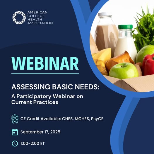 Join us on September 17 for an ACHA webinar exploring how colleges assess basic needs insecurity, define “basic needs” on campus, and use tools like the Hope Center Survey and ACHA’s adapted version for a comprehensive assessment. Be part of the conversation and help shape more effective support systems for students. Register here: https://bit.