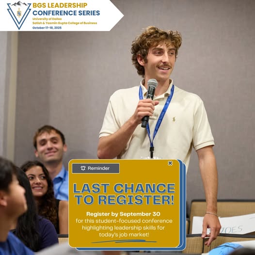 Today (September 30) is your final chance to register for the BGS Leadership Conference Series, October 17- 18, at the University of Dallas Satish & Yasmin Gupta College of Business. What’s in store: -A panel of 5 experienced professionals sharing industry insights on navigating disruption and new opportunities. -Speakers like Irving Ashford Jr.