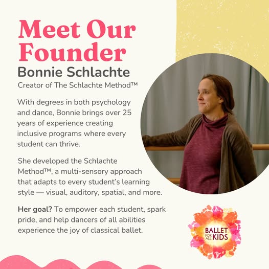 Meet Bonnie, our inspiring founder and instructor behind The Schlachte Method™ ✨ With degrees in psychology and dance, and over 25 years of experience, she has created a powerful and inclusive way to teach ballet—one that meets every dancer where they are. Her method helps students of all learning styles thrive through a warm, engaging, and empowering environment. Ready to experience it for yourself.
