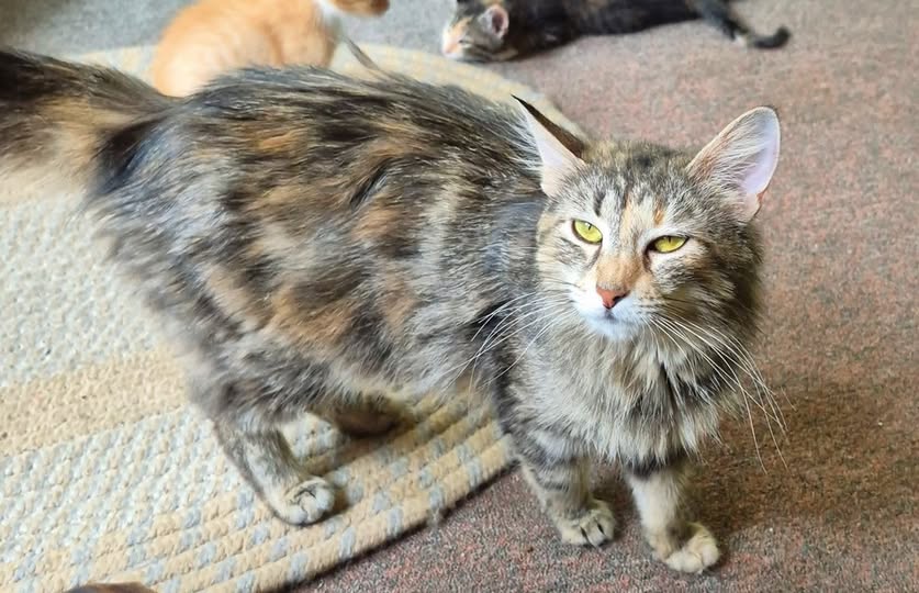 Gigi is a beautiful, long-haired girl with tabico coloring in her pretty coat. At just one year old, she was recently a mom, but her babies are gone now. She's still willing to sometimes let other kittens nurse, though I believe she just does so because it comforts them.