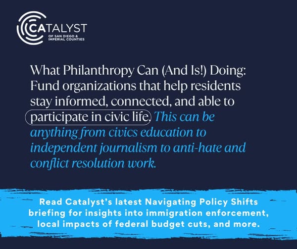 Just dropped π© Catalyst's newest Navigating Policy Shifts breaks down what philanthropy can (and is. ) doing to support local communities and a healthy democratic process. Top tip π Fund organizations that help residents stay informed, connected, and able to participate in civic life.