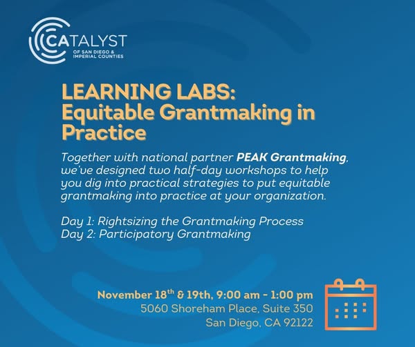 Grab your spreadsheets, dust off your Theory of Change, rally your stack of notebooks: Catalyst Learning Labs are your office hours to get things done πͺ In these hands-on workshops, you can bring your own materials to translate learning into practical action and put equitable grantmaking into practice at your organization. https://catalystsd. org/event/learning-labs-equitable-grantmaking-in-practice/ #ProfessionalDevelopment #EquityInPhilanthropy #sandiegoevents #philanthropy PEAK Grantmaking.