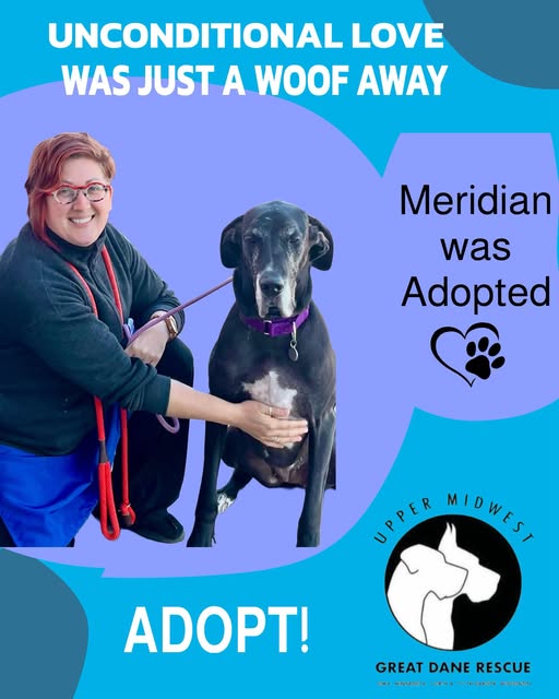 Sweet Meridian came into our rescue one year ago this week struggling with frequent, difficult to manage seizures. UMGDR was able to provide excellent foster and veterinary care to support, evaluate and eventually find the appropriate medications, diet and care routine to successfully manage her seizures. An amazing adopter fell in love with Meridian and committed to continue her detailed care plan as her forever girl 💞 We are happy to share that 5 other Great Danes have also been adopted so far this month❣️.