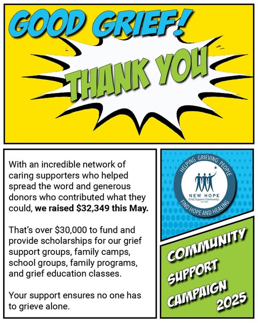 🩵THANK YOU to our generous supporters during our Good Grief Campaign. We are grateful that we can continue fulfilling New Hope’s mission to bring hope and healing into the lives of bereaved adults, children, and families through connection and support. Your support ensures no one has to grieve alone.