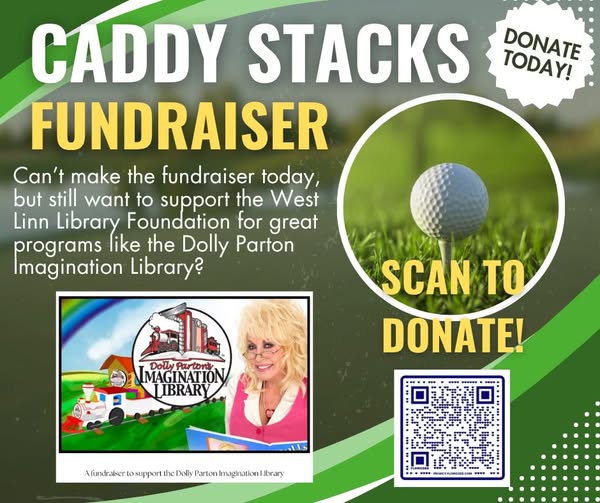 A heads up that the West Linn Public Library closes today at 3 PM. and that means for YOU to come on by Caddy Stacks, our 9 hole mini-golf fundraiser for the Dolly Parton Imagination Library and other great programs. Scan the QR code for tickets and see you there.