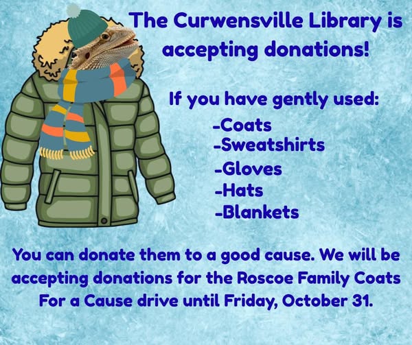 For the rest of October, we will be acting as a collection site for the Roscoe Family Coats For a Cause drive. We will be accepting donations until Friday, October 31. More information on the drive and the distribution days is available through the link below.