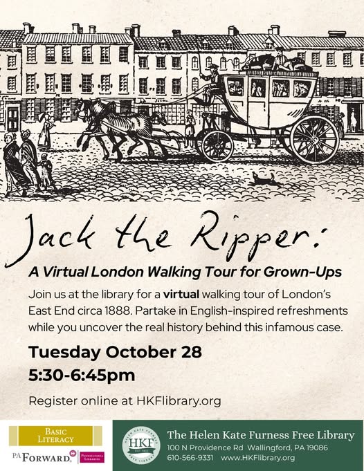 In 1888, “Jack the Ripper” terrorized London’s East End, targeting women struggling to survive in Whitechapel’s poverty. His crimes, shrouded in both fact and legend, continue to fascinate today. Join us at the library on Tuesday October 28 for a virtual walking tour documentary courtesy of Tours by Foot – London.