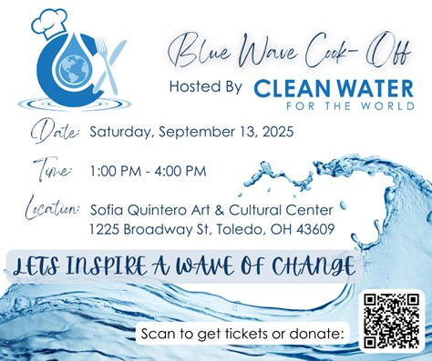 You are invited to The Blue Wave Cook Off, hosted by CWFW. This in-person fundraising event will be held in Toledo, Ohio and will be a fun time of food and community. The Blue Wave Cook Off is your chance to sample creative “blue twist” dishes from local Toledo chefs and help support Clean Water for the World.
