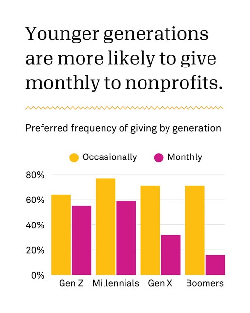 Do you prefer to give on a monthly or occasional basis. While donors of all generations prefer to give occasionally, younger generations are beginning to also give on a more regular, monthly schedule. Learn more about the differences in giving by generation: https://candid.