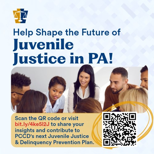 🗣️ Your Voice Matters. The Pennsylvania Commission on Crime and Delinquency (PCCD) is asking for your feedback to help shape the future of juvenile justice in our state. This quick, anonymous survey will guide the Juvenile Justice and Delinquency Prevention Committee (JJDPC) in developing recommendations to the Governor on how to improve Pennsylvania’s juvenile justice system and youth prevention efforts.