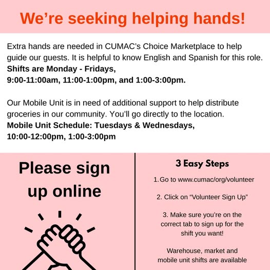 CUMAC Save the Date September 18th to Celebrate CUMACs 40 Years of Service Save the Date September 18th to Celebrate CUMACs 40 Years of Service Save the Date September 18th to Celebrate CUMACs 40 Years of Service Be a part of our big crazy dreams Feeding people changing lives CUMACs mission is to fight hunger and its root causes through a holistic traumainformed approach that provides groceries and basic necessities to families and individuals in need. Proactive Food Policy CUMAC believes ending hunger is about wrapping supportive services around individuals and families so that they are able to get the resources they need to flourish. Our appointmentbased Choice Marketplace gives power to our guests and space for volunteers and guests to get to know each other. Diversity and Community Representation CUMAC hires from the community and has community members drive interventions and programs.