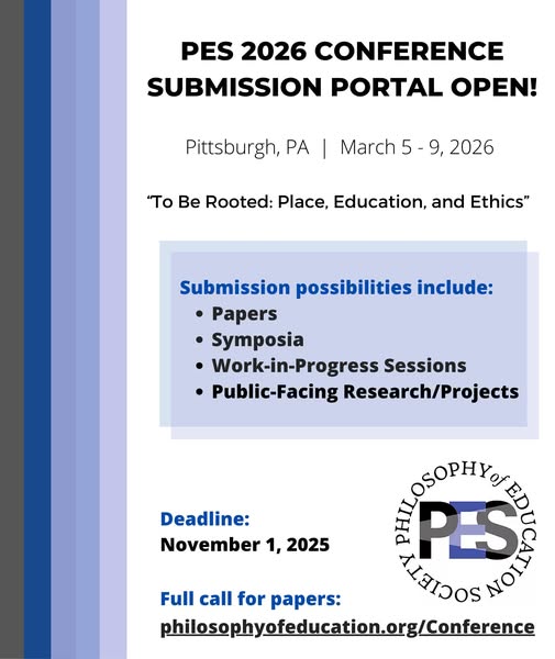 Philosophy of Education Society - Home Philosophy of Education Society The Philosophy of Education Societyis an international forum that promotes the philosophic treatment of educational practice policyandresearch advances the quality of teaching the philosophy of education and cultivates fruitful relationships between and among philosophers philosophers of education and educators. Register for thePES 2025 Conference Education and the Future of the Future Preconference workshopPhilosophy of Education beyond the Human March 610 2025 Baltimore MarylanD 2024 PES Award winners Photo left to rightPhoto of Legacy Award recipient Noah Khan and2024 PES Program Chair Amy Shuffelton the Outstanding Paper Award is sponsored jointly by PES and Educational Theory Photo left to rightPhoto of 2024 PES Program Chair Amy Shuffelton Outstanding Paper award recipient Annie Schultz and editor of Educational Theory Nick Burbules Finalists for this award David Biesecker Derek Gottlieb and Yuya Takeda For more information about these awards and past winners please see PES Awards. Upcoming Events ContactNatasha Levinson email nlevinsokent. edu .