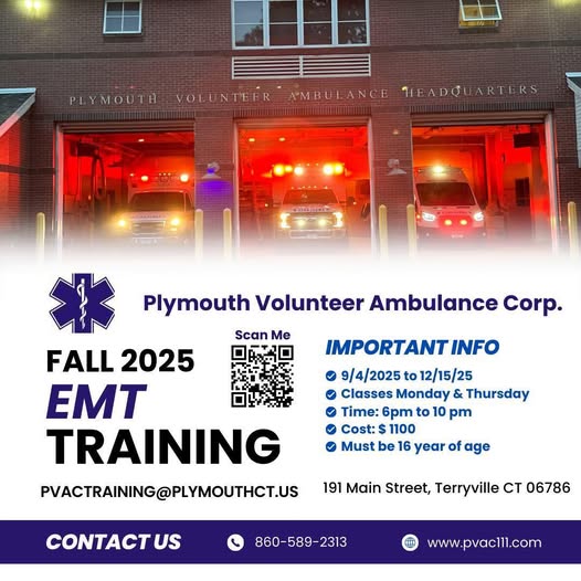 IF YOU HAVE AN EMERGENCY CALL 911 1891 calls in 2023 IF YOU HAVE AN EMERGENCY CALL 911 IF YOU HAVE AN EMERGENCY CALL 911 Welcome to the Plymouth Volunteer Ambulance Corps Celebrating over 50 Years of Service to Plymouth Terryville Pequabuck Join Us A few hours of your time can mean life or death to others. About Us Plymouth Volunteer Ambulance Corps was established in 1968 to provide emergency medical services to the Town of Plymouth CT. Including Terryville Pequabuck Plymouth Village. We also provide mutual aid service to the Town of Thomaston and the City of Bristol.