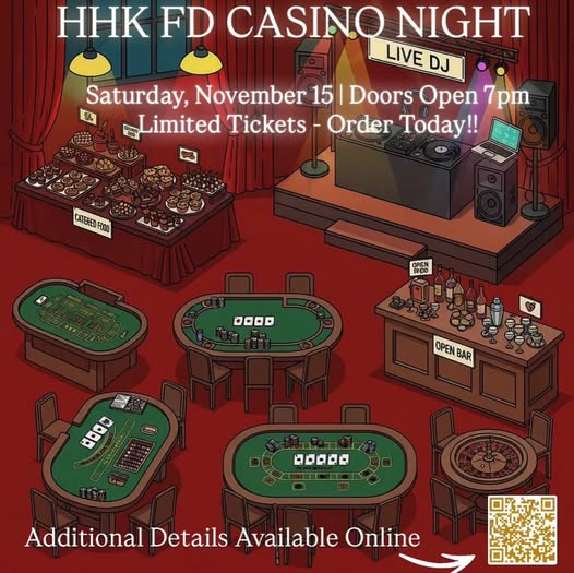Date Night | Men's Night Out | Ladies Night Out - we have a solution - The 2025 Ho-Ho-Kus Volunteer Fire Department Casino Night is a night filled with fun, gaming, and celebration with neighbors and friends. The ticket purchase includes 500 in chips for our table games (Blackjack, Poker, Roulette & Craps), catered food, beverages, an open bar, special select spirit tasting table, and entertainment with a live DJ. Limited tickets available - secure your tickets today.