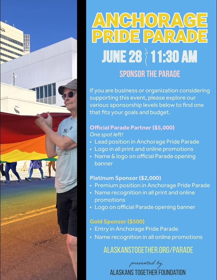 Alaskans Together Foundation (ATF) is again hosting the Anchorage Pride Parade and we are looking for sponsors. If you are interesting in supporting one of the largest LGBTQ+ events in Alaska, check out the available levels below and click the link to get started. https://www.