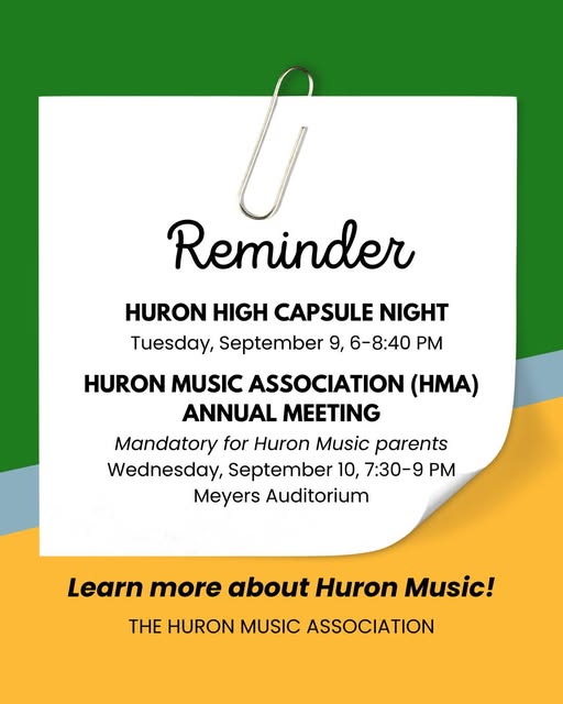 Come learn more about Huron Music and even see music education in action. - Huron Capsule Night - Please Join the Huron Music Directors for Capsule Night after you attend the IB and Principal Meetings (6:00pm - 6:45pm). You will have the opportunity to meet the Huron Music Directors as you follow your child's daily schedule.