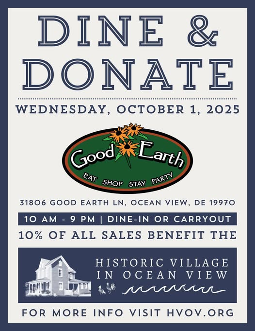 Friendly reminder: Good Earth has graciously agreed to a Dine and Donate event at their restaurant this Wednesday, October 1, 2025, 10AM - 9PM. 10% of proceeds (dine-in and carry-out) will go to the Historic Village in Ocean View. Note: This event takes place in the original Good Earth restaurant and doesn't include the restaurant in the Dickens Theatre building.