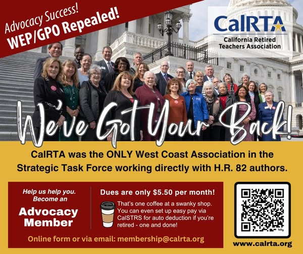 Retired AND active educators should join CalRTA (www.calrta.org). Our 3 core issues: Protecting Retirement Security Repealing the Social Security Penalties Supporting California's Public Education System