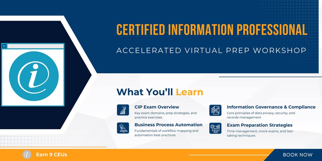 Fast-Track Your CIP Certification. π Join us for the Certified Information Professional (CIP) Accelerated Virtual Prep Workshop β three live, instructor-led sessions that get you exam-ready in just 9 hours. π October 14β16, 2025 | π 1β4 PM ET π» Online via Microsoft Teams π https://hubs.