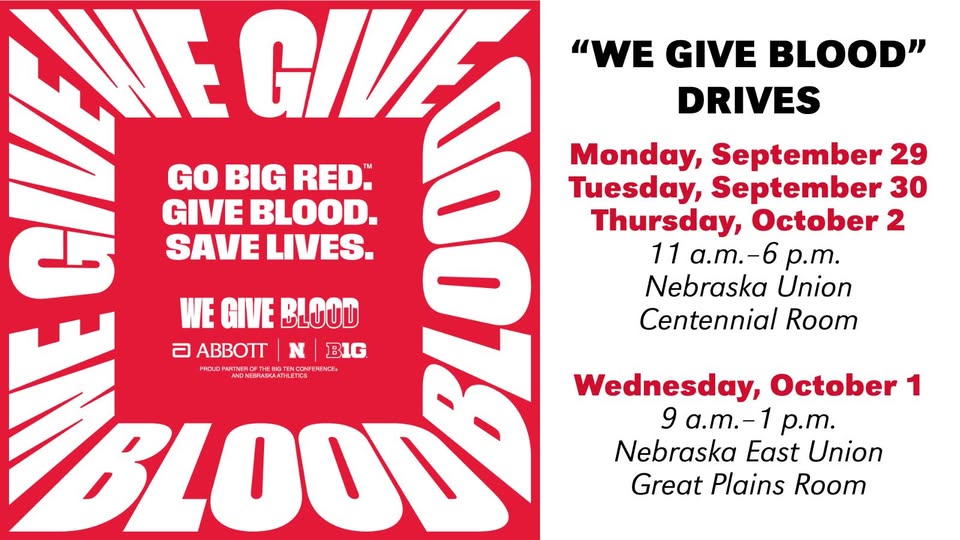 THIS WEEK: University of Nebraska-Lincoln students, faculty, staff and all Husker fans are invited to participate in a series of Homecoming “We Give Blood” drives tomorrow through Thursday. Each pint of donated blood can save up to three lives & helps defend Nebraska's “We Give Blood” title.