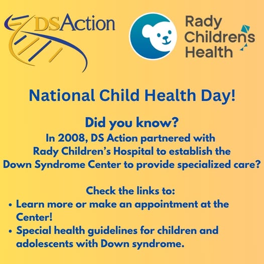 Did you know National Children's Health Day is observed on the first Monday of October. The perfect day to spread awareness for our very own Down Syndrome Center: https://downsyndromeaction. org/down_syndrome_center/ The Special Health Guidelines for Children and Adolescents with Down Syndrome: https://publications.