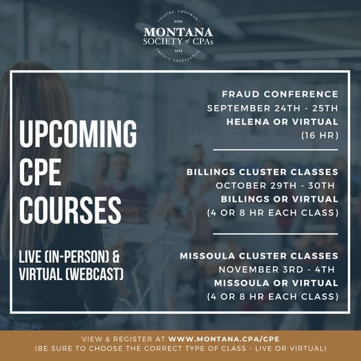 MTCPA has several great learning opportunities coming up: ✅ Fraud Conference – deep dive into prevention, detection, and investigation. ✅ Missoula & Billings Cluster Classes – flexible sessions designed to fit your schedule and learning goals. 👉 See full details and register: https://www.