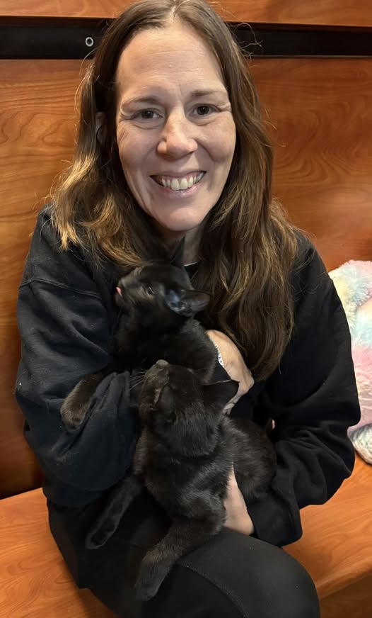 Stogie and Linda Lou will be spending their first night in their new home tonight; together. You will have to look closely at this pic to see the arms full of love with this amazing, wonderful lady/new mom. They have a wonderful new dad too and some human siblings.