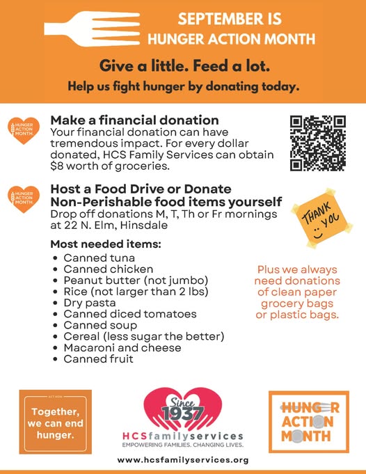 HCS Family Services | Empowering Families. Changing Lives. HCS Family Services Empowering Families. Changing Lives. We provide groceries to over 360 food insecure families at our pantries in Hinsdale and Willowbrook. Our Hinsdale Pantry has MOVED Please read below very carefully New address effective August 20th 22 N Elm St.