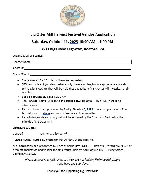 Home - Big Otter Mill Welcome to Big Otter Mill Welcome to a small gem of history located in Bedford Virginia. Our mission is simpleto preserve and restore the Big Otter Mill for the purpose of protecting the architectural integrity of the structure and to restore operation of the mill in the interest of historic preservation to provide educational opportunities for students and the community and to promote tourism in the region. Click here for photos from our 2023 Spring Festival Connecting the Past with Our Present. Events Learn more about our upcoming events and how you can get involved.