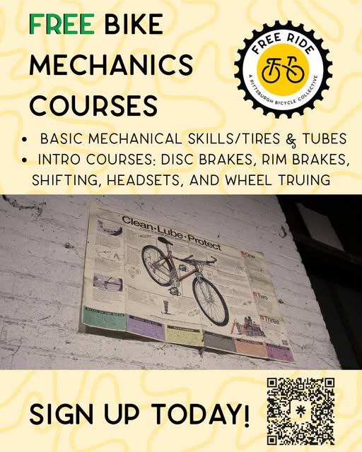 freeridepgh Home Welcome to Free Ride We focus on learning how to repair bikes so bikes go back to the community. Welcome to Free Ride We focus on learning how to repair bikes so bikes go back to the community. Visit Our Shop At Free Ride you can come by yourself and find a community of people interested in the same things you are bikes. Stop in to volunteer night to help the cause and earn 15hour in store credit.
