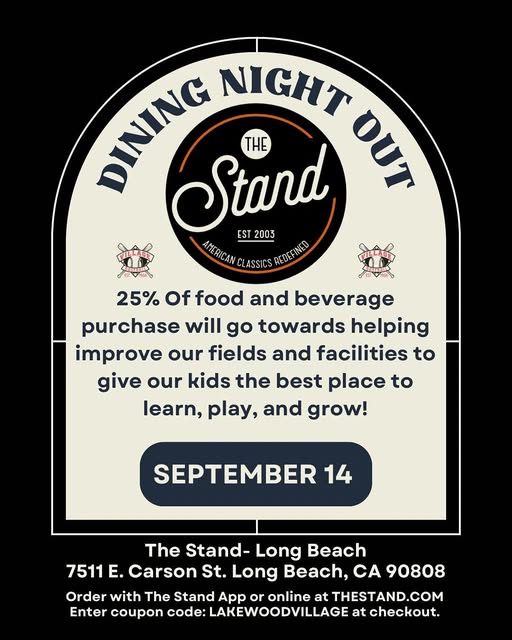 Take the night off from cooking and join us for Dining Night Out at The Stand on September 14. ๐ญ๐๐ฅ Bring your family, invite your friends, and enjoy a delicious meal while supporting Village Little League. A portion of the proceeds will go right back to our league.