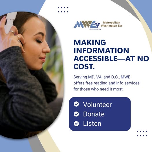 The Metropolitan Washington Ear brings FREE current news and information to people who are blind, have low vision, or are print disabled in MD, VA, and DC. The Metropolitan Washington Ear Inc. offers radio reading and other services for blind, visually impaired, and physically disabled people who cannot effectively read print. Our team of more than 200 volunteers is committed to sharing information to all. Since 1973, the Metropolitan Washington Ear, Inc. (MWE) has worked to “bring the printed word to the visually impaired” by providing immediate, independent, and free access to essential printed news and information readily available to sighted individuals. MWE currently serves 5,000 blind, visually-impaired, and physically-disabled persons who cannot effectively read print materials throughout Maryland, Virginia, and the District of Columbia through its specially-trained volunteer base of 400 people. Many MWE listeners are elderly and live in nursing homes or assisted-living facilities where independence and equal access are critical.