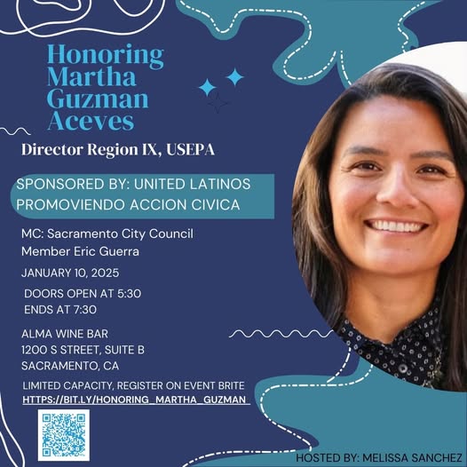 Join United Latinos on January 10, 2025 from 5:30 pm to 7:30 pm at Alma Wine Bar as we honor Martha Guzman Aceves for her outstanding contributions to our community. City Council Member Eric Guerra will MC the event. This event is a celebration of Martha's dedication and hard work.