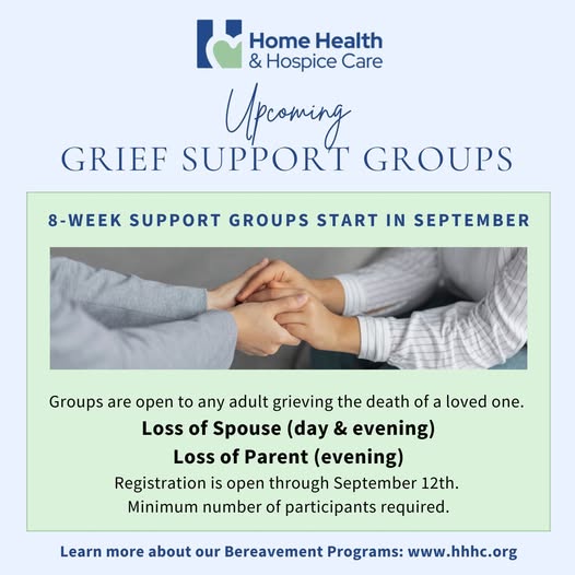 💛 Fall Grief Support Groups – Registration Now Open 💛 Grief support groups offer a safe, compassionate space for conversation, healing activities, and peer support. Loss of Spouse (day & evening) & Loss of Parent (evening) Please register by September 12th: call 603-420-1914 or email traci. davies@hhhc.