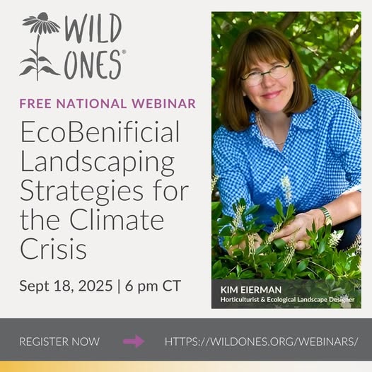 🌿 Free Webinar: EcoBeneficial Landscape Strategies for the Climate Crisis 🌎 Discover how native plants and ecological landscaping can make your yard more resilient—and help fight climate change. Join Wild Ones and environmental horticulturist Kim Eierman, author of The Pollinator Victory Garden, for a practical look at climate-smart landscape strategies rooted in science and native biodiversity. 📅 Thursday, Sept 18 | 🕕 6 PM CT 💻 Live premiere + YouTube chat 🎟️ Register now: https://wildones.