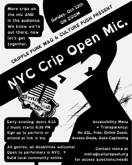 New York City. Join Cripple Punk Mag and Culture Push for NYC Crip Open Mic, a place for disabled musicians and fans to connect and celebrate crip music. New York’s music scene is full of venues without elevators, basements with no seats and filled with rooms of people without masks.