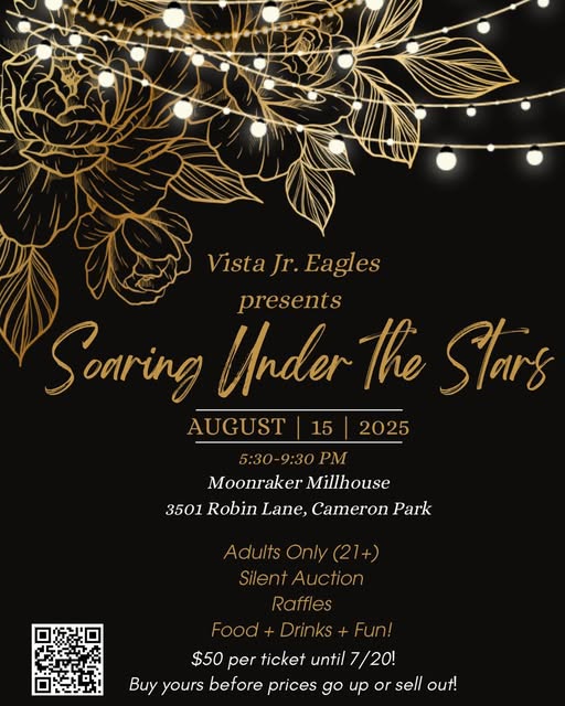 ✨🌙 A night of fun, laughter, and cheer, let’s make our Vista Eagles proud this year. 🦅📣 Join us for Soaring Under the Stars, an adults-only fundraiser supporting Vista Jr Eagles Football & Cheer 🏈💙 📍 Moonraker’s Millhouse 📅 August 15th | 5:30–9:30 PM 🎟️ Tickets: $50 until 7/20– available now through the VJE Store - grab yours before prices go up or we sell out. ) What’s in store: 🍽️ Food & drinks 🎟️ Raffles + Silent Auction 🎉 A night to connect, give back, and celebrate our amazing community.