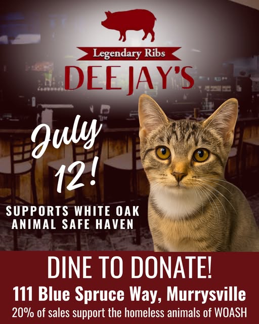 On July 12, head to Dee Jay's Lounge - Murrysville for a meal that makes a difference. When you dine at their Murrysville location (π111 Blue Spruce Way), 20% of sales will go directly to support the homeless animals of White Oak Animal Safe Haven. Every bite helps us provide love, care, and second chances to cats and dogs in need.