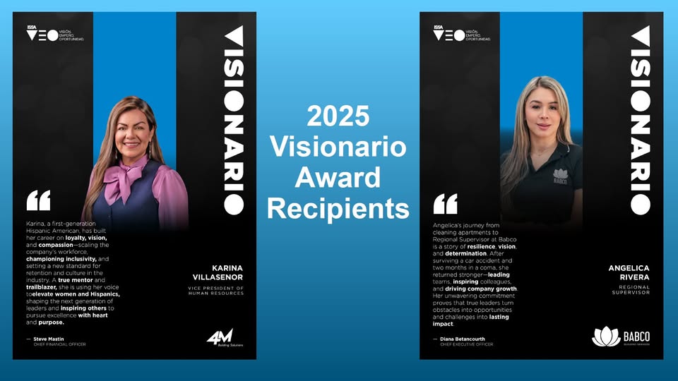 Congratulations to the 2025 ISSA VEO Visionario Award Recipients. Please join us in celebrating two powerhouse leaders who are redefining excellence in the cleaning industry: Karina Villasenor Vice President of Human Resources, 4M Building Solutions A champion of workforce development and culture-building, Karina has transformed HR into a vehicle for empowerment—elevating frontline professionals into future leaders and opening doors for advancement across every level of the organization. Anglieca Rivera Regional Supervisor, Babco Service LLC Known for her relentless integrity and people-first leadership, Anglieca proves that true influence isn’t given—it’s earned.