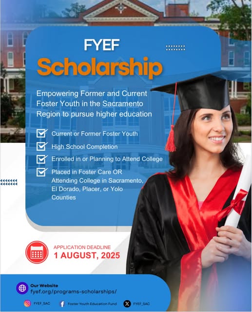 The Foster Youth Education Fund is a non-profit organization created to generate and disburse education grants to emancipating foster youth. Access to FYEF Resources: https://linktr.ee/FYEF_Sac The Foster Youth Education Fund empowers former foster youth in the Sacramento region to achieve their higher education dreams. We provide educational support for those who have successfully completed their high school education and who are entering or attending a two or four-year accredited college or university, or a technical/trade school. Because of the support we provide, 91% of our scholars complete the semester for which they received our support. Since 2002, Foster Youth Education Fund has empowered former foster youth in the Sacramento region to achieve their higher education dreams. While there are many scholarship funds in the region, FYEF is the only known fund in the Sacramento, Yolo, Placer and El Dorado counties to focus exclusively on foster youth.