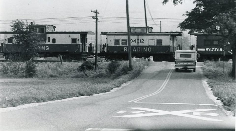 Reading Railroad (RDG) caboose #94012 along with an extended vision RDG caboose and a Western Maryland Railway caboose at Barnitz crossing on September 2, 1974. Photo by Jim Bradley (Photo ID# B1-A05-07-03). https://cumberland.