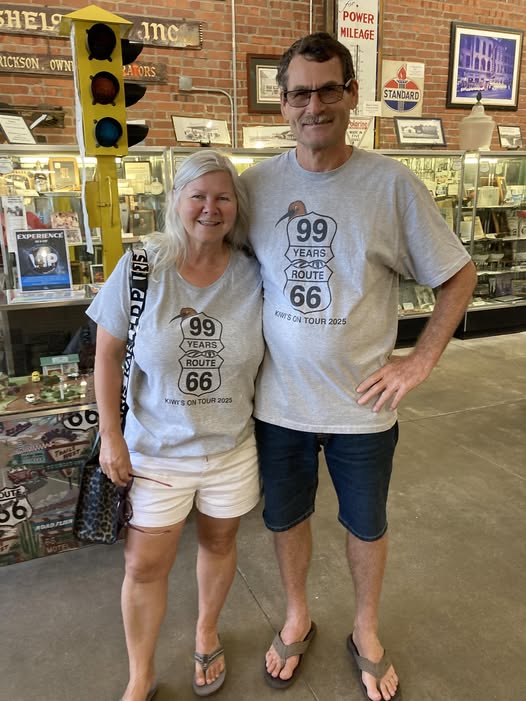 Chrissy and Ian from New Zealand, “Kiwis on Tour 2025”, visited the Rt 66 Hall of Fame & Museum today. Look at the fabulous shirts they had made specifically for their visit. We’ve seen 100 years t-shirts spring up already but these are the first 99 years.