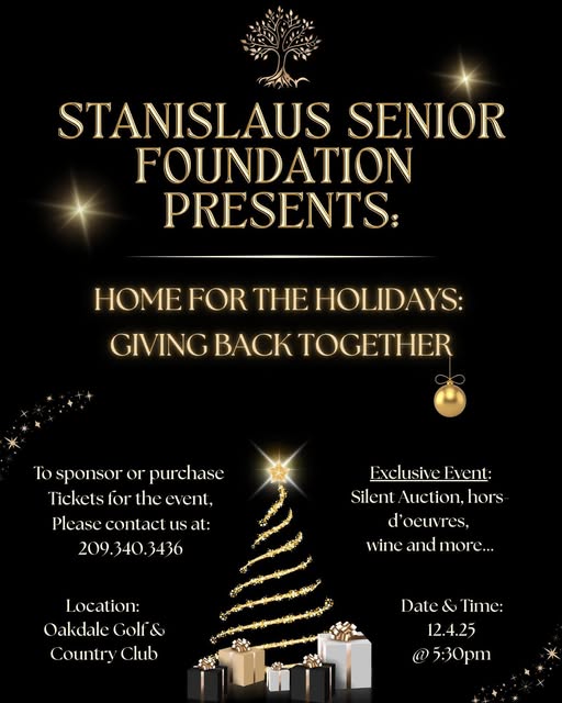 🎄✨ Home for the Holidays: Giving Back Together ✨🎄 Presented by the Stanislaus Senior Foundation Join us for a truly special evening as we come together to celebrate the season of giving and the spirit of community. On December 4, 2025, at the beautiful Oakdale Golf & Country Club, the Stanislaus Senior Foundation invites you to an exclusive event filled with warmth, generosity, and purpose. 🕠 5:30 PM 📍 Oakdale Golf & Country Club Enjoy an elegant night featuring: 🍷 Fine wine 🍴 Delectable hors d’oeuvres 🎁 A curated silent auction 💙 And the joy of giving back Your presence and support will help us continue our mission to enhance the quality of life for seniors across Stanislaus County — providing resources, dignity, and connection to those who have given so much to our community.