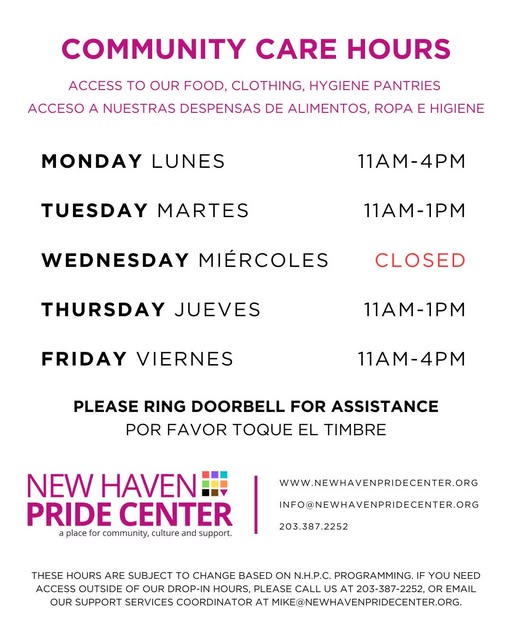 Did you know -- @newhavenpridecenter has community care drop-in hours throughout the week. 💫 You can feel welcome to come in and access our food pantry, clothing closet, hygiene station, and explore all of the other resources we have to offer to the community. 💖 These hours also provide a chance for you to meet the staff, check the space out, give you a place to do some school work, remote work, or even just to hang out.